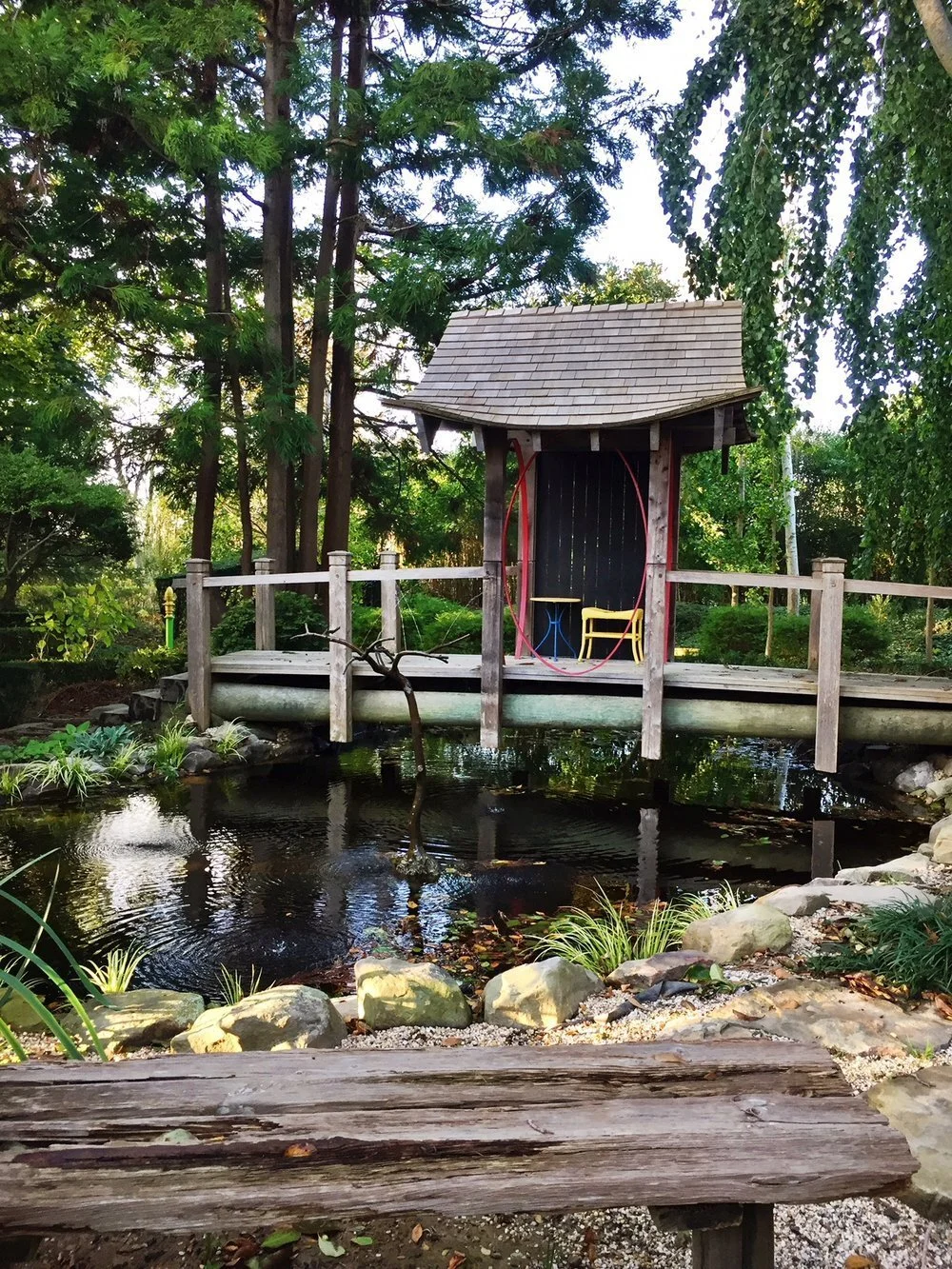 The garden is a cocktail of historic and geographic influences. This Japanese- inspired bridge, structure, and man-made frog pond are theatrical and whimsical.