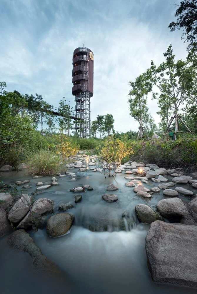 In early 2012, the PTT Reforestation Institute commissioned the landscape architects of Bangkok to design a space for reforestation. Initial analysis indicated the dredging of soil as the excavation created pits for illegal refuse dumping, inspiring them to create a new terrain for forest regeneration. Non-compostable waste was cleared while the rest was allowed to decompose. Approximately 37,000 cu.metres of earthwork was introduced and graded with 6,000 cu.metres of planting soil to create a suitable terrain. Berms and topography create little"micro-ecologies" which lend to it's ecological diversity. They also implemented a pre-mixture of highly fertile, organic soil (3-parts Topsoil, 1-part Raw Rice Husk, 1-part Coconut Coir Dust, 1-part Chicken Manure) as a soil medium suitable for the lowland species saplings. A skywalk + observation tower were designed to minimize disturbance of the burgeoning forest and allow close-up views of the maturing canopy.